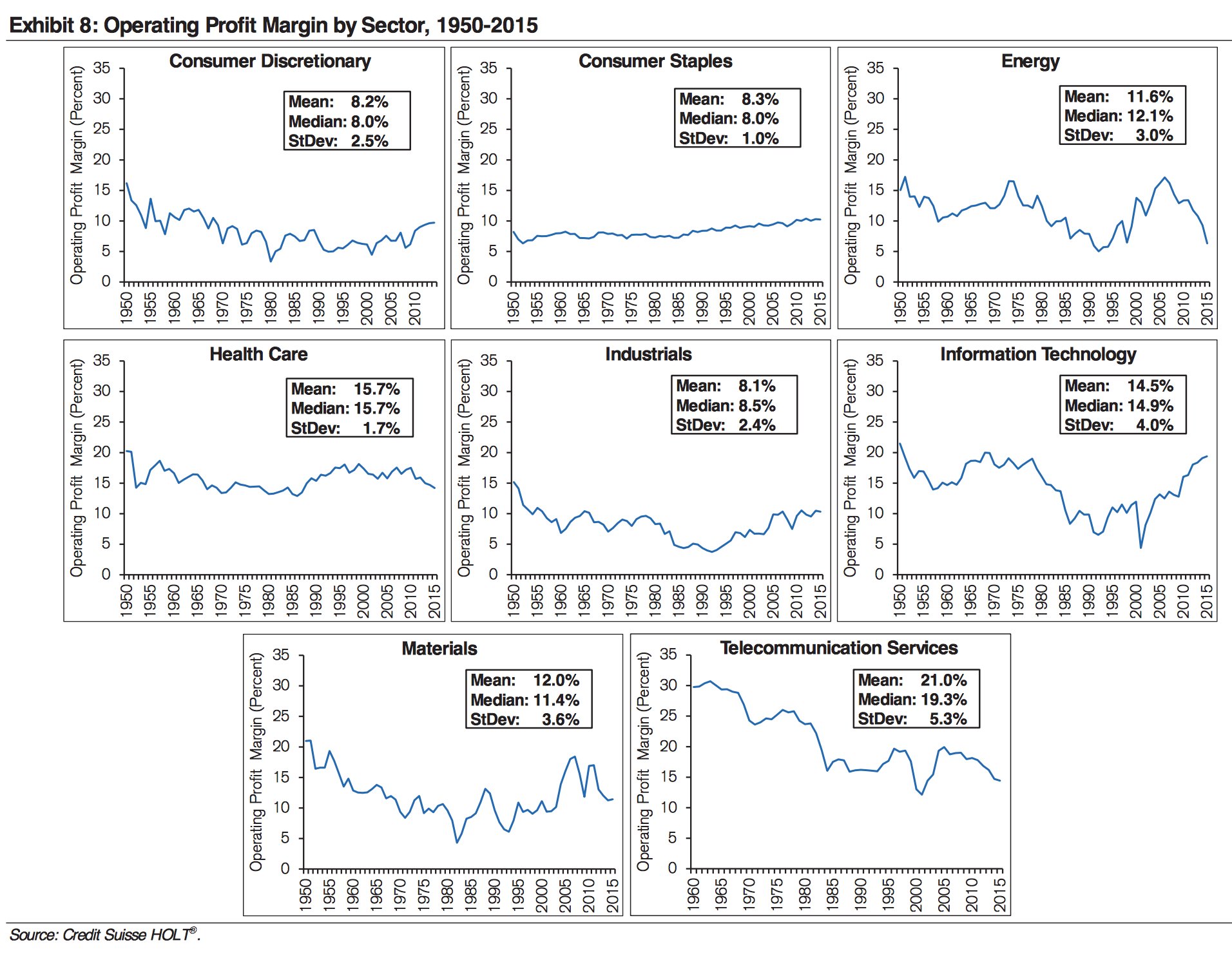 Die Theorie stabiler Gewinnmargen kann empirisch belegt werden. Die Gewinnmarge ist in keinem Wirtschaftssektor so stabil wie im Verbrauchsgütersektor (Consumer Stapels). Diese Berechenbarkeit macht die Aktien für langfristige Anleger so interessant. Schon heute kann mit einer sehr hohen Wahrscheinlichkeit davon ausgegangen werden, dass die großen Unternehmen der Branche auch in 10 Jahren noch Milliarden verdienen werden. Bildquelle: Credit Suisse.